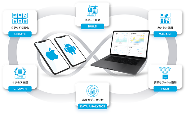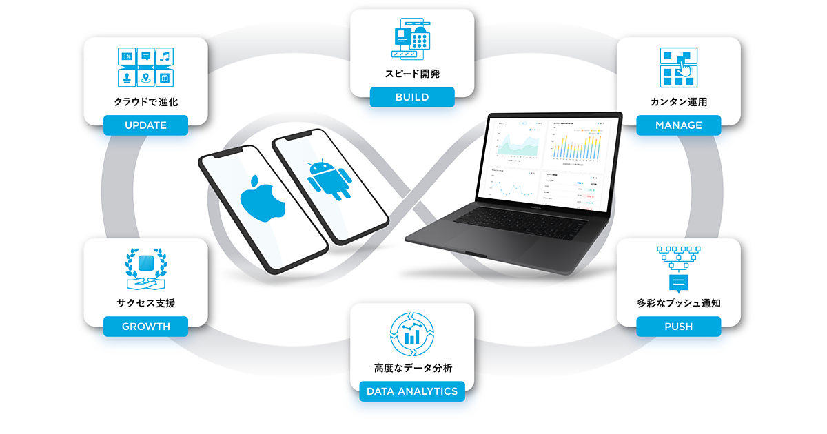 Yappliはプログラミング不要(ノーコード)で「iOS」と「Android」の両OSに対応したネイティブアプリをスピード開発できる。リニューアルではCMSをコードレベルから見直して機能の拡張性を高めた。アプリでよりリッチな表現ができるようになり、データ基盤の刷新でアプリの状態チェックが簡単になった。高度な分析やデータ連携も可能になった。