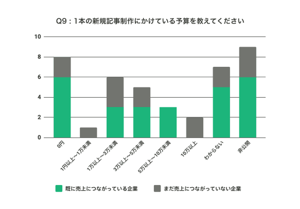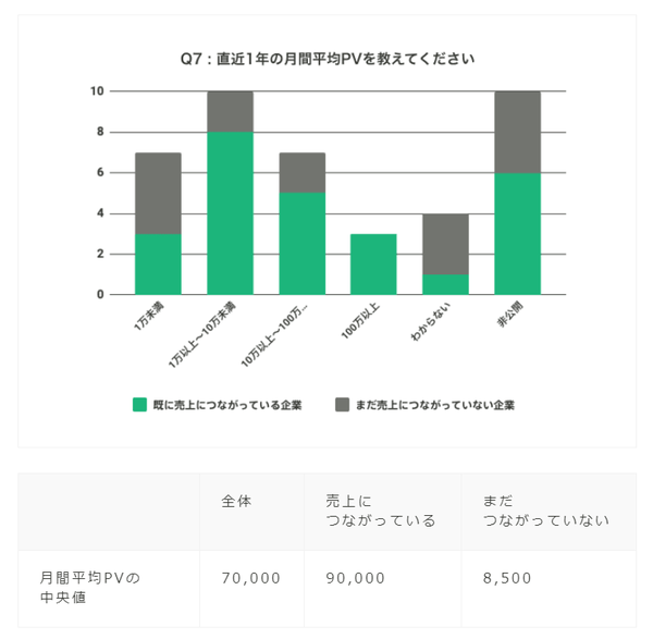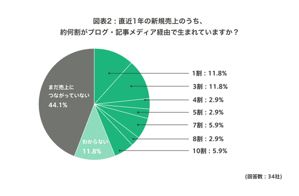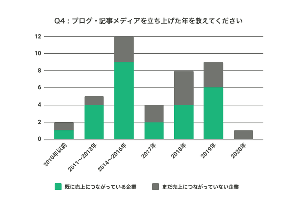 そこで「すでに売上につながっている企業」と「そうでない企業」を比較してみた。「ブログ・記事メディアの主たるターゲット」「メディアを立ち上げた年」について明確な差はなかったが、「新規売上の3~10割がメディア経由」と答えた成功企業11社のうち10社が「2018年以前」と答えており、売上への貢献には1年以上の長期的な取り組みが必要だと考えられる。