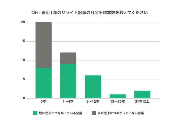「直近1年の新規公開記事の月間平均本数」「直近1年のリライト記事の月間平均本数」を聞くと、新規は「月4本(≒週1本)」リライトは「月0本」と回答した企業が多かった。新規記事公開本数は成果と関連性がなく、1日1本以上公開していても売上につながっていない企業もあったという。