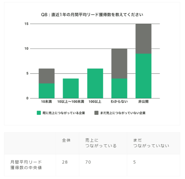 売上につながっている企業とそうでない企業では「直近1年の平均月間PV」に明確な差があり、「直近1年の平均月間リード獲得数」では、14倍の差があった。
