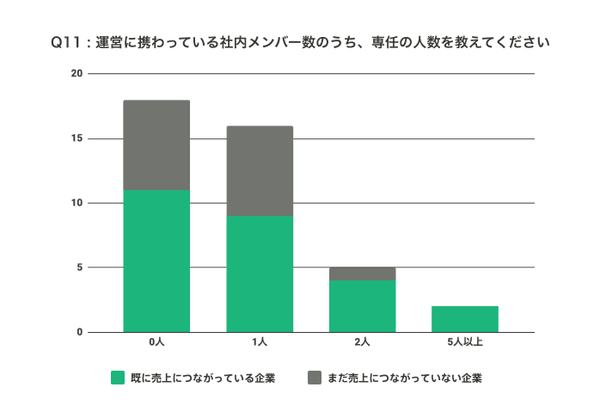 続いて運営コストを計るべく、「1本の新規記事制作にかけている予算」「運営に携わっている社内メンバー数」「社内メンバー数のうち、専任の人数」を聞くと、中央値は、20,000円、運営メンバー2人、専任メンバー1人だった。専任メンバー0人という企業が43.9%(18社)で、兼任体制が主流のようだ。一方、新規記事制作予算や専任メンバー数は、成果との関連性がなかった。