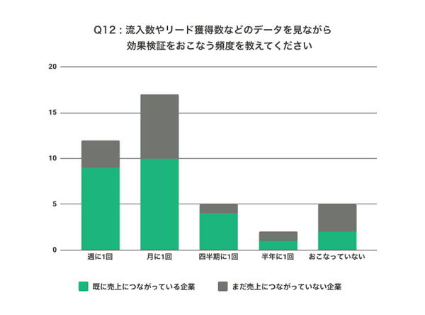 また効果検証の頻度も「週に1回~月に1回」が7割以上ながら、成果との関連性はあまり見受けられなかった。