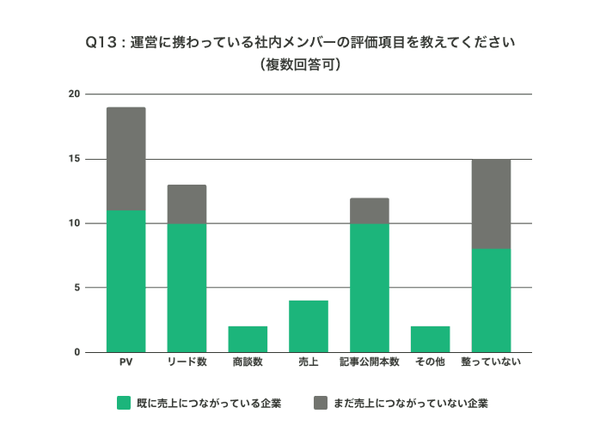 運営メンバーの評価については、売上につながっている企業ほど、「PV」だけではなく「リード数」「記事公開本数(リライト含む)」を評価項目に入れていた。