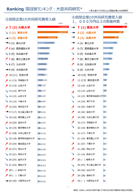 この傾向は、受入額1,000万円以上の民間企業との「大型共同研究」でも同じで、大阪大学が受入額で東京大学を抜いて1位となっている。