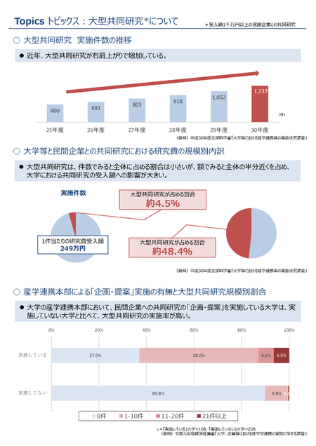 両省は、産学官の連携を推進することを目的に、共同研究強化のためのガイドラインをとりまとめている他、大学における取り組み状況や、産業界との連携実績などのデータを「大学ファクトブック」として毎年公開。各大学の基本情報と合わせ、外部資金(共同・受託研究実績)の状況、共同研究の実施件数、特許出願・活用実績などの情報を取りまとめている。