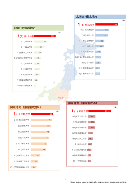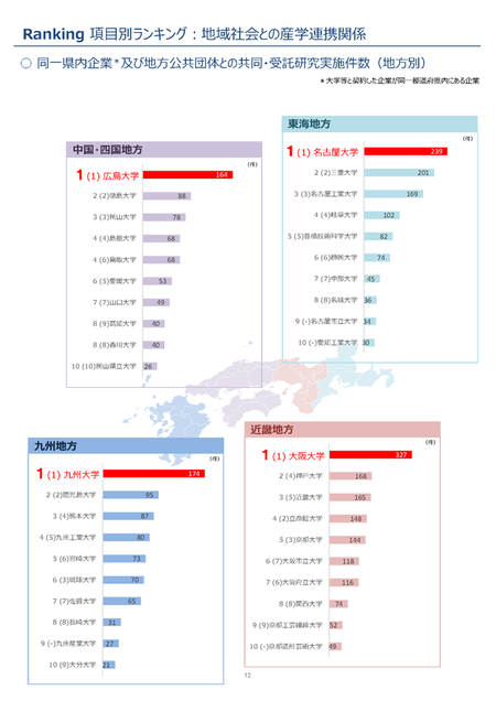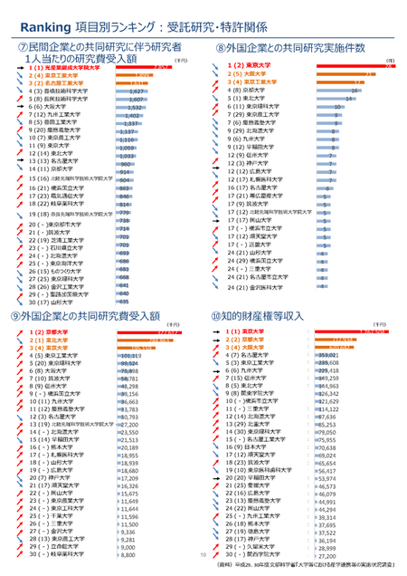 なお外国企業との共同研究実施件数では、前年1位の東北大学は5位に後退し、東京大学が1位。外国企業との共同研究実施件数では東京大学が1位。外国企業との共同研究費受入額は京都大学が1位。知的財産権等収入は引き続き東京大学が1位だった。