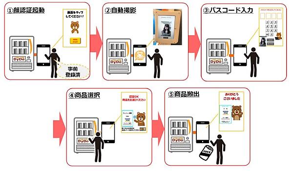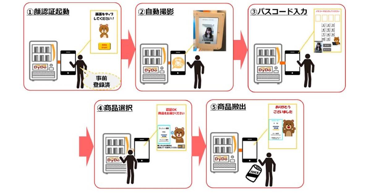 顔認証決済自販機は、事前にスマートフォンやタブレットなどの端末で顔の画像、決済用のクレジットカード情報、パスコードを登録し、顔とパスコードの2つで認証する。購入する時は自販機の顔認識システムが起動して自動撮影し、その後、購入者がパスコードを自販機に入力して商品を選び、商品を持ち出す仕組みとなる。