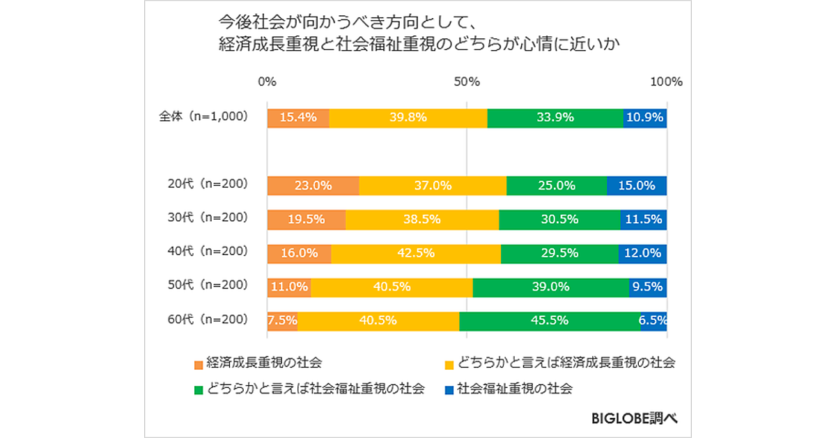 次に「新型コロナウイルスの流行を経験し、今後社会が向かうべき方向として、経済成長重視と社会福祉重視のどちらがあなたの心情に近いか」と聞くと、「経済成長重視」15.4%、「どちらかと言えば経済成長重視」39.8%、「どちらかと言えば社会福祉重視」33.9%、「社会福祉重視」10.9%で、“経済成長重視”が55.2%、“社会福祉重視”が44.8%と、経済成長派が多いながら、ほぼ意見が2つに分かれた。若年層ほど経済成長派が多く、年齢が上がるほど社会福祉派が増える傾向が見られた。