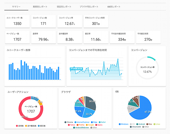 新しいログ解析レポートには5種類のレポートを実装している。フォーム全体の状況を俯瞰(ふかん)して把握できるサマリー▽任意の期間のデータの変化が分かる日別▽フォームの項目ごとのエラー発生状況・離脱状況を調査する項目別▽ユーザーの閲覧環境ごとの離脱・CVなどを比較するブラウザ別▽OS別--の5つとなる。