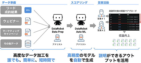 この連携ソリューションは膨大な複数のデータの統合とAI(人工知能)による高精度なリードスコアリング=リード(見込み客)の購買意欲の評価(スコア化)=が可能。Salesforce Sales Cloudと外部データをDataRobotのシステムで統合し、それを基にDataRobotのAIがデータ分析モデルの中から最適なモデルを自動構築して精度の高いリードスコアリングを行う。