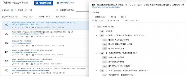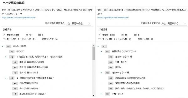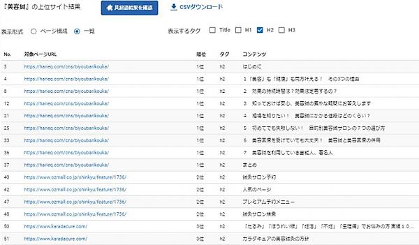 上位20サイトに関し、見出しの構成が分かり、文字数の平均値・中央値・最大値の抽出が可能なうえ、画像・動画の埋め込み数などユーザーインターフェースに関連するデータが抽出できる。発リンク・内部リンクの数を算出して順位への影響の調査も実現する。任意に指定した2つのサイトのページ分析結果も比べられる。