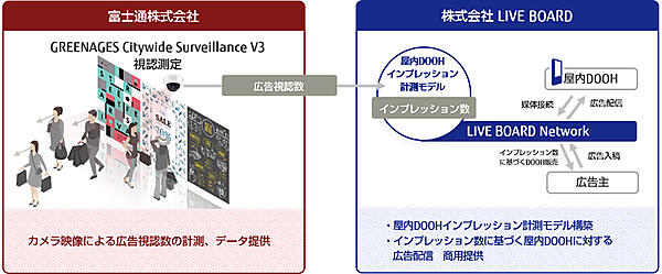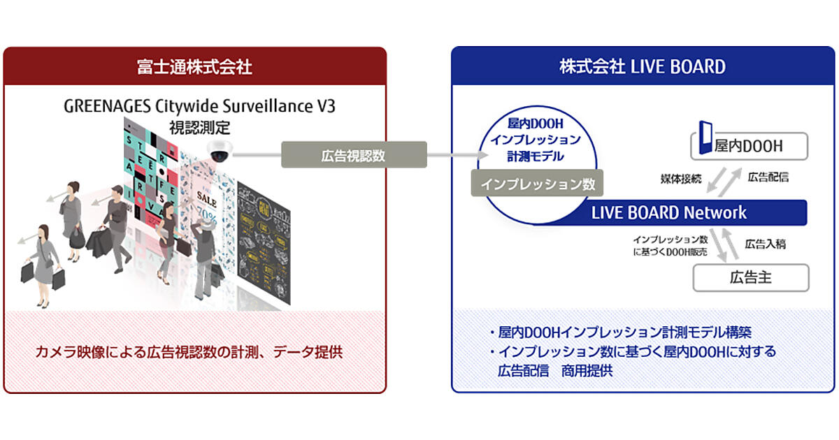 NTTドコモと電通グループが出資するデジタル交通・街頭広告(DOOH)広告配信プラットフォーム事業のLIVE BOARD(ライブボード)と富士通は、屋内のDOOH広告の広告視認数(インプレッション)計測モデルを構築した、と7月8日発表した。富士通のAI(人工知能)画像解析ソリューションで測定した視認数などのデータを基にする。