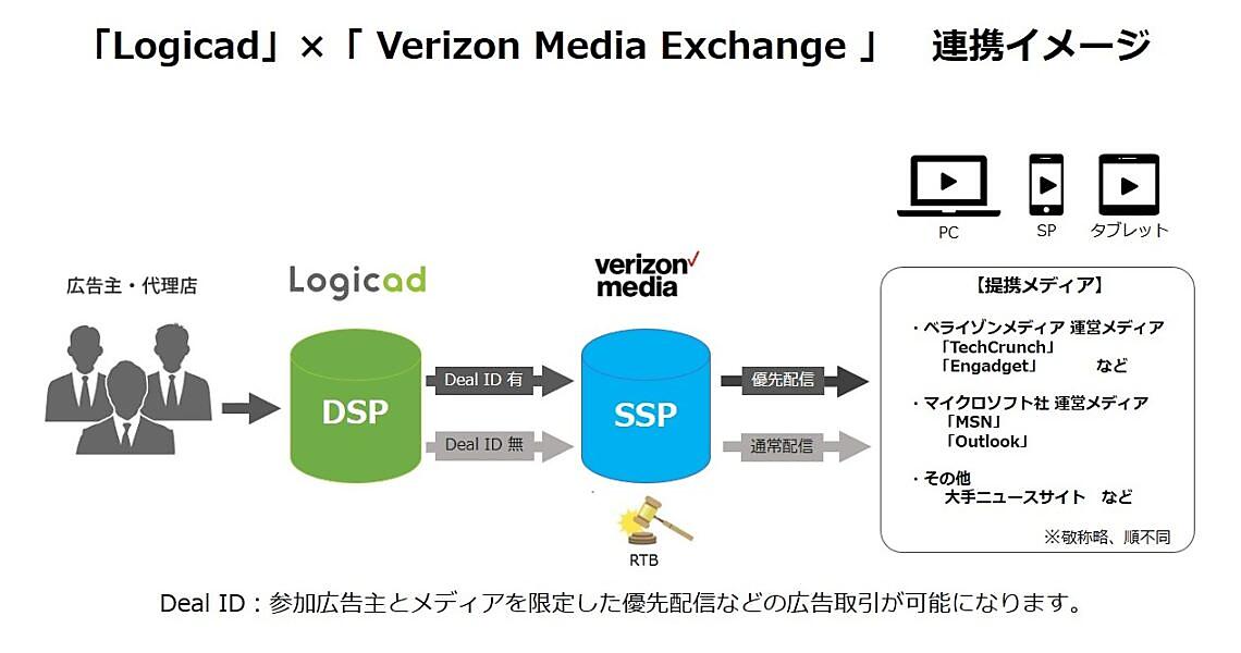 Verizon Media Exchangeは米国、英国、台湾など世界的に展開するSSP。ベライゾンメディアが展開するメディアをはじめ、パートナーになっている「MSN」などさまざまなプレミアム媒体への導入実績がある。Logicad経由で広告を出稿している企業は、今回の連携で多くの付加価値の高いメディアへの配信が随時可能になる。Deal IDでの広告枠の優先取引も実現する。