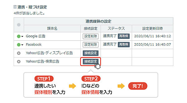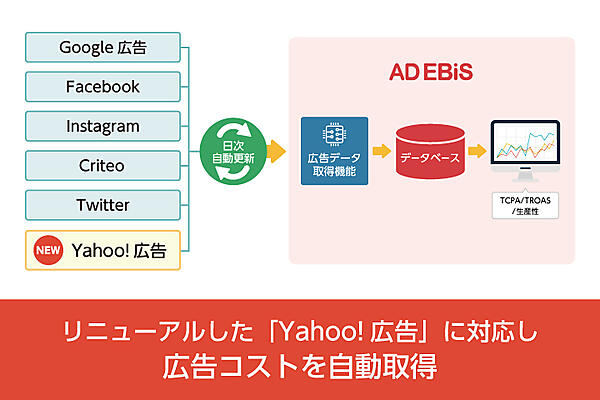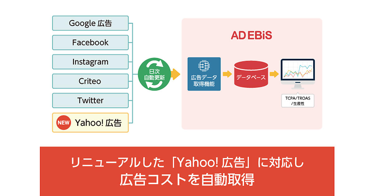 マーケティングロボット開発のイルグルム(ロックオンから2019年8月1日社名変更)は、同社のマーケティング効果測定プラットフォーム「アドエビス」で、「Yahoo!広告」の広告データ自動取得を7月15日から始めた、と同日発表した。リニューアルしたYahoo!広告に対応して新たに連携し、広告コストを自動で取得する。