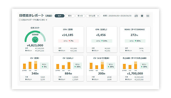 CPA(成果単価)やROAS(投資広告コスト回収率)など主要指標の進捗状況、コストの消化状況、月末の着地見込みなど成果判断に必要な各種情報を6媒体で確認して、迅速な現状把握が可能になる。広告データを基にキャンペーン施策の評価や予算配分の最適化などスピーディーな意思決定に役立てられる。