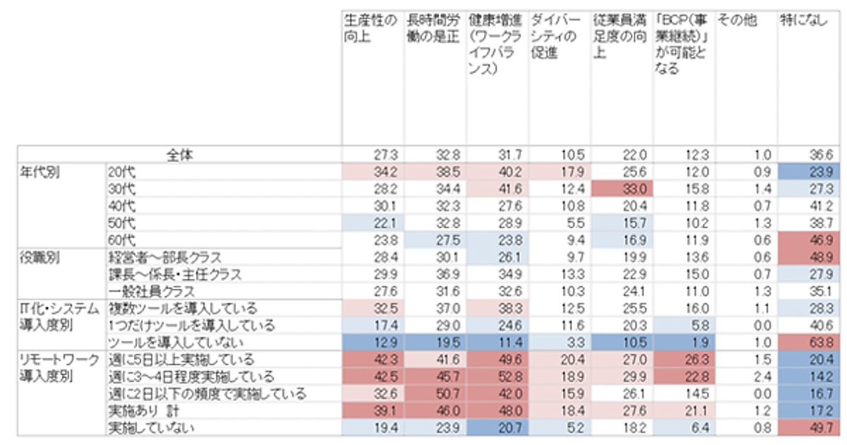 「今後、在宅勤務を導入または継続する場合のメリット」を聞くと、「長時間労働の是正」32.8%、「ワークライフバランス」31.7%、「生産性の向上」27.3%などが上位。20代・30代は全体より高いが、年齢が下がるほど数値は下がる。60代だと「とくになし」が46.9%と最も高い。さらに経営者~部長クラスは48.9%が「とくになし」としており、テレワークのメリットを実感していないことが明らかとなった。