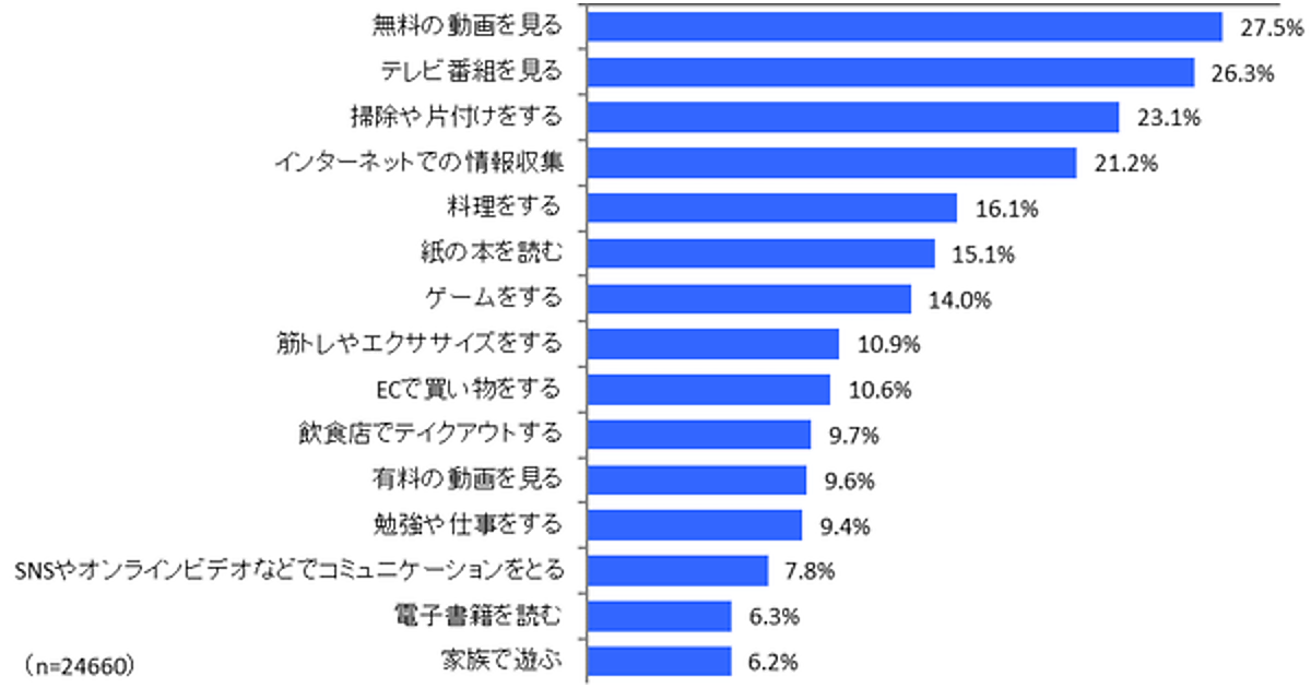 「外出自粛にともない在宅時間が増えたことで、どのような活動が増加したか」を全体に聞いたところ、「無料の動画を見る」27.5%が最多。次いで、「テレビ番組を見る」26.3%、「掃除や片づけをする」23.1%、「インターネットでの情報収集」21.2%が上位だった。