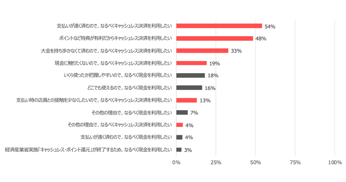 今後については、「引き続き利用したい」という人は65%。理由面では「支払いが早く済む」54%、「ポイント特典が有利」48%が上位だが、「現金に触りたくない」19%とコロナ禍を意識した回答も一定数あがっている。