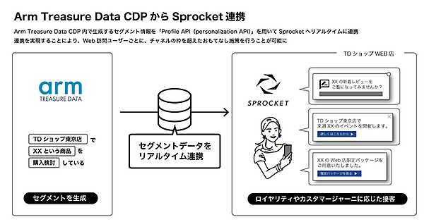 Arm Treasure Data CDPの顧客データを基に、戦略に基づいてマーケターがセグメントを生成。そのセグメント情報を「Profile API」を用いてSprocketにリアルタイムで連携する。これにより、Web訪問ユーザーごとに異なるロイヤルティ(信頼・忠誠心)やカスタマージャーニー(顧客が購入に至る過程)に応じた接客をWebサイト上で行える。