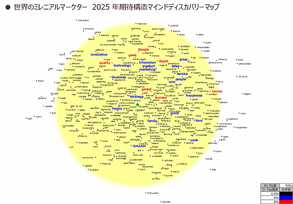 この調査では、インテージ独自のリサーチ&創発プログラム「デ・サインリサーチ」を使い、まず世界のミレニアムマーケターの思う“近未来のありたい姿”(マーケティング業界への期待構造)を「マインドディスカバリーマップ」として可視化した。“2025年時点のマーケティング活動のキーワード”という設問への回答となる。