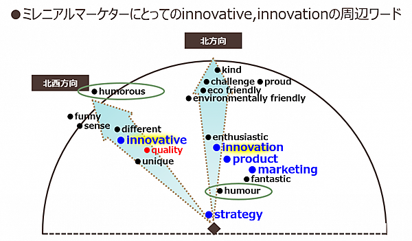 「innovative」「innovation」を含む領域全体を見ると、「humorous」「funny」「sense」、あるいは「humour」「fantastic」「enthusiastic」といった単語が存在する。「innovative」「innovation」は、ユーモア、センス、楽しさ、遊び心と表裏一体だと、マーケターが考えていることが分かる。