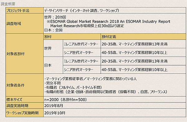 調査対象の内訳は、ミレニアルマーケター(20~35歳でマーケティング業務経験13年未満のマーケター)日本500人+世界500人の計1,000人、シニアマーケター(40~55歳でマーケティング業務経験10年以上)日本500人+世界500人の計1,000人、合計2,000人となっている。