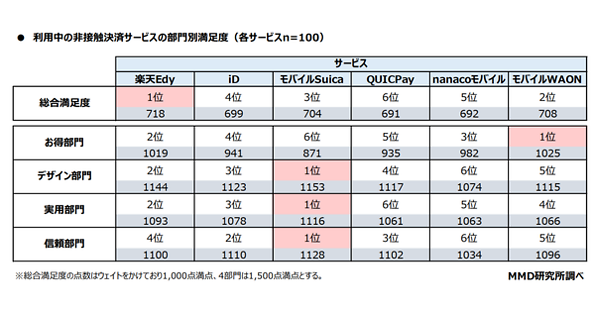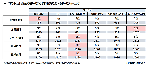 これらのサービスをメイン利用している各利用者100人ずつに、満足度を「お得部門」「デザイン部門」「実用部門」「信頼部門」の4部門で分けて聞くと、お得部門では「モバイルWAON」、デザイン部門、実用部門、信頼部門では「モバイルSuica」がそれぞれ部門トップとなったが、総合満足度では「楽天Edy」がトップだった。