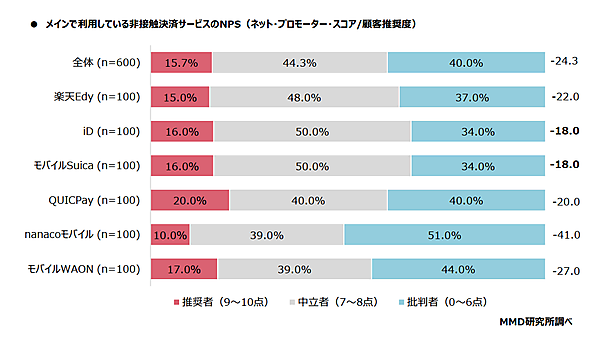また「メイン利用しているサービスを家族や友人に勧めたいか」を聞き、「NPS」(ネット・プロモーター・スコア/顧客推奨度)を算出すると、サービス別のNPSは「iD」と「モバイルSuica」がマイナス18.0でもっとも高かった。