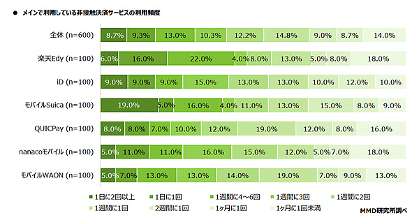 さらに「メインで利用している非接触決済サービスの利用頻度」を見ると、「1日に2回以上」は「モバイルSuica」が19.0%に達しており、それに「iD」9.0%、「QUICPay」8.0%が続く。一方「1日に1回」を加算すると、「モバイルSuica」24.0%に、「楽天Edy」22.0%、「iD」18.0%の順となる。さらに「1週間に1回以上利用する」という回答は、「モバイルWAON」71.0%、「nanacoモバイル」70.0%、「楽天Edy」69.0%となり、流通大手のWAONとnanacoが、回数は少ないが上位に入る。