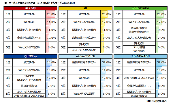 各サービスの満足度の背景を探るべく、「現在メインで利用している非接触決済サービスを知ったきっかけ」を聞くと、「公式サイト」20.3%、「店舗の案内やポスター」13.8%、「Webメディアの記事」9.8%が上位だった。nanacoモバイル、モバイルWAONは「店舗の案内やポスター」が上位で、実店舗での告知がやはり強い。