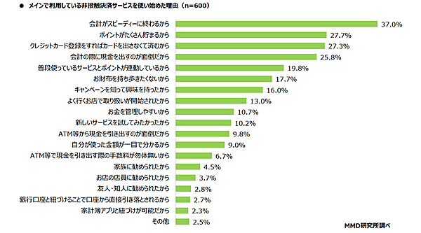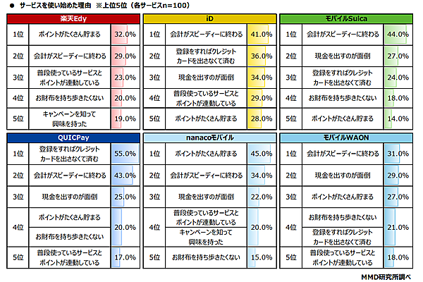 一方で全体に、使い始めた理由を全体に聞くと、「会計がスピーディーに終わるから」37.0%、「ポイントがたくさん貯まるから」27.7%、「クレジットカード登録をすればカードを出さなくて済むから」27.3%が上位。楽天Edy、nanacoモバイルのトップは「ポイントがたくさん貯まるから」、iD、モバイルSuica、モバイルWAONは「会計がスピーディーに終わるから」、QUICPayは「登録すればクレジットカードを出さなくて済む」と、各サービスで傾向は分かれている。