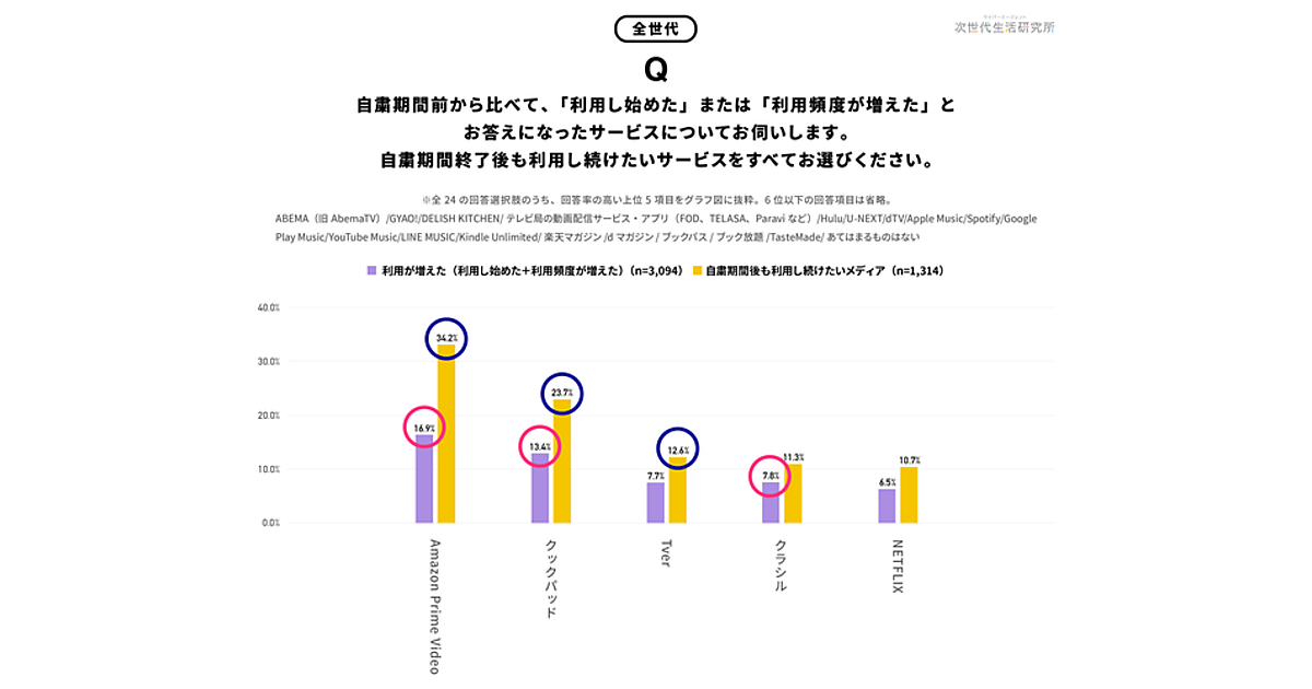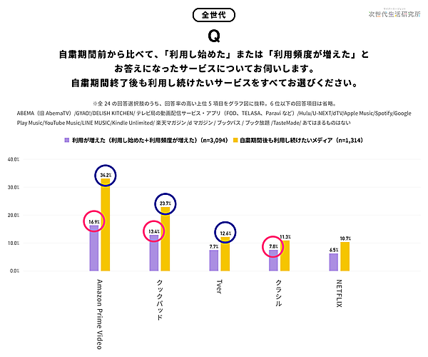 一方、自粛期間中に利用頻度が増えたサービスは、「Amazonプライムビデオ」16.9%、「クックパッド」13.4%、「クラシル」7.8%、「TVer」7.7%、「NETFLIX」6.5%。自粛期間終了後も引き続き利用し続けたいサービスは、「Amazonプライムビデオ」34.2%、「クックパッド」23.7%、「TVer」12.6%だった。やはり動画配信と料理系が強い。