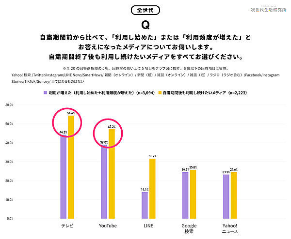 自粛期間中に利用頻度が増えたメディアは「テレビ」44.3%、「YouTube」39.0%、「Google検索」24.6%の順。自粛期間終了後も利用し続けたいメディアは「テレビ」54.4%、「YouTube」47.2%、「LINE」31.7%が上位だった。