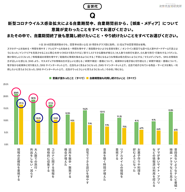 なお「自粛期間前に比べて意識が変わったこと」を聞くと、1位「情報の正確性を重視する」20.8%、「大人数での旅行・外出をしない・減らす」18.5%、「コロナに関連する情報を積極的に収集する」17.1%が上位だった。