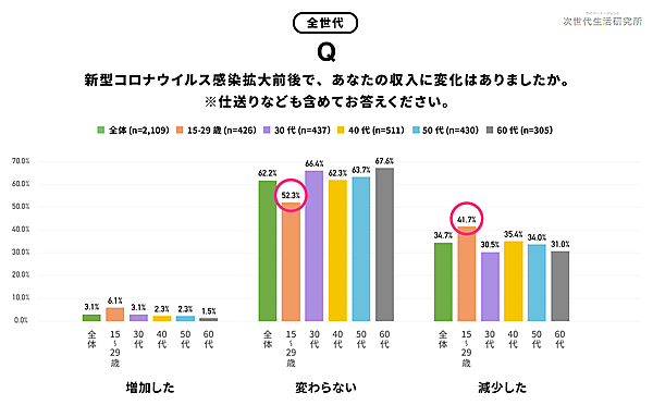 収入の増減については、「減少した」34.7%、「変わらない」62.2%で、影響はありつつも変わらないという人が主流。年代別では、15~29歳で「減少した」が他年代より高い。