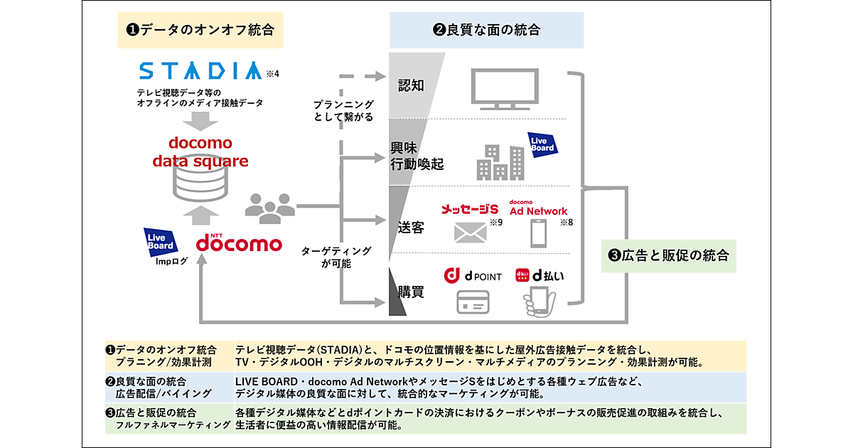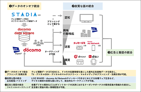ドコモが持つ位置情報データや「dポイント」の会員データと、電通グループのテレビ・デジタルなどのメディア接触データ、LIVE BOARDが配信可能なデジタルOOHの配信ログ、D2Cの広告配信ログを統合する。これによってオフラインデータとオンラインデータ、ID単位でターゲティングが可能なメディア広告と販売促進それぞれの統合を実現する。