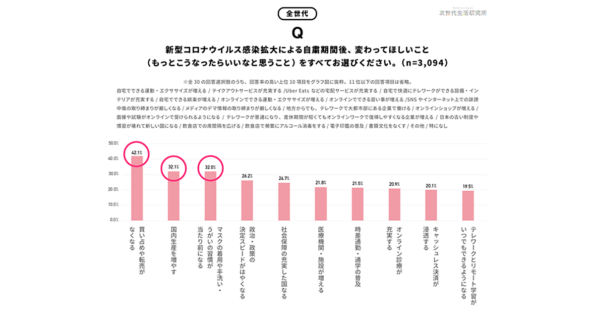 最後に「自粛期間終了後、変わってほしいこと(もっとこうなったらいいなと思うこと)」を聞くと、「買い占めや転売がなくなる」42.1%、「国内生産を増やす」32.1%、「マスクの着用や手洗い・うがいの定着」32.0%と、日常の衛生習慣に関することに答えが集中した。ただし、「政治・政策の決定スピードが速くなる」「社会保障が充実した国になる」「オンライン診療が充実する」「キャッシュレス決済が普及する」「テレワークとリモート学習がいつでもできるようになる」といった声も2割前後あり、ニーズは高い。