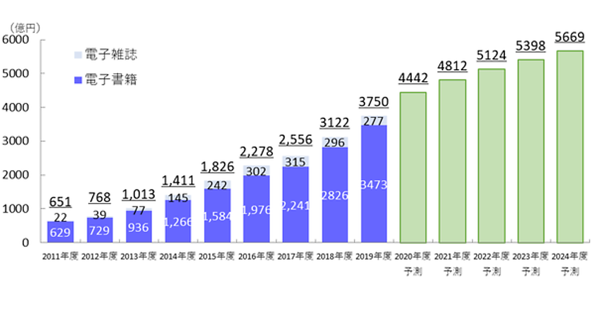 まず、2019年度の「電子書籍の市場規模」は3,473億円、2018年度の2,826億円から647億円(22.9%)増と推計された。「漫画村」などの海賊版サイトが社会問題となったが、2017年~2018年に相次いで閉鎖されたことで、正規サイトの利用促進が続いている。今後は順調に拡大傾向が続き、2024年度には5,669億円程度になると予測されている。