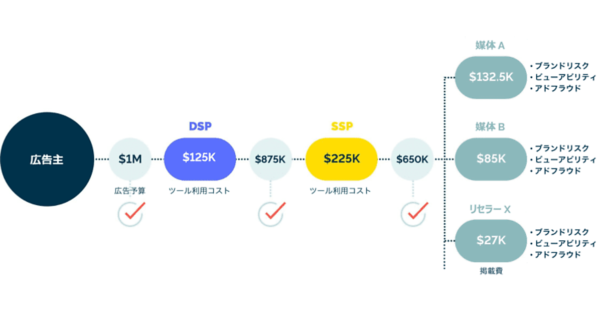質の高いインプレッション(表示回数)に「支払われた金額」と、アドフラウド(広告詐欺)やビューアビリティ(閲覧できる状態の広告表示)が低く不適切なインプレッションに「消費された金額」と選別して把握できる。広告取引の全コストと掲載面の品質がリアルタイムでわかり、品質の高いメディア広告枠と安全な配信経路に広告予算を配分できる。