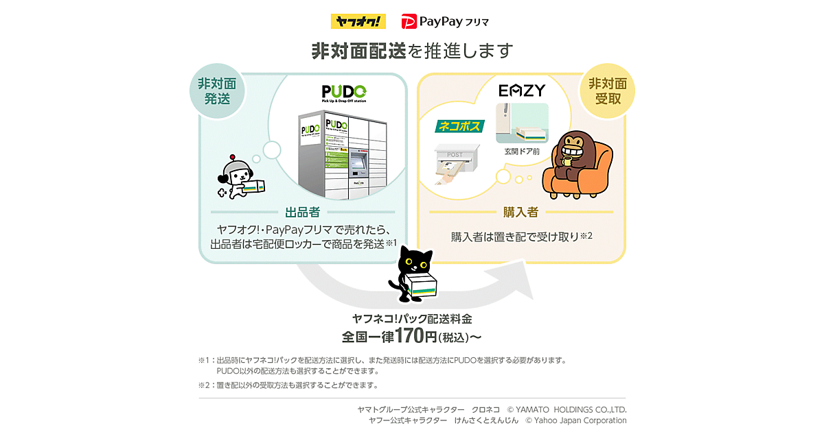 ヤフーとヤマト運輸は、ヤフーのインターネットオークション「ヤフオク!」、フリーマーケットアプリ「PayPayフリマ」で、非対面配送の連携を強化する、と8月24日発表した。両社が提供する全国一律の配送サービス「ヤフネコ!パック」のポスト投かんサービス「ネコポス」の送料を9月1日に個人間取引最安の170円(税込み)にする。