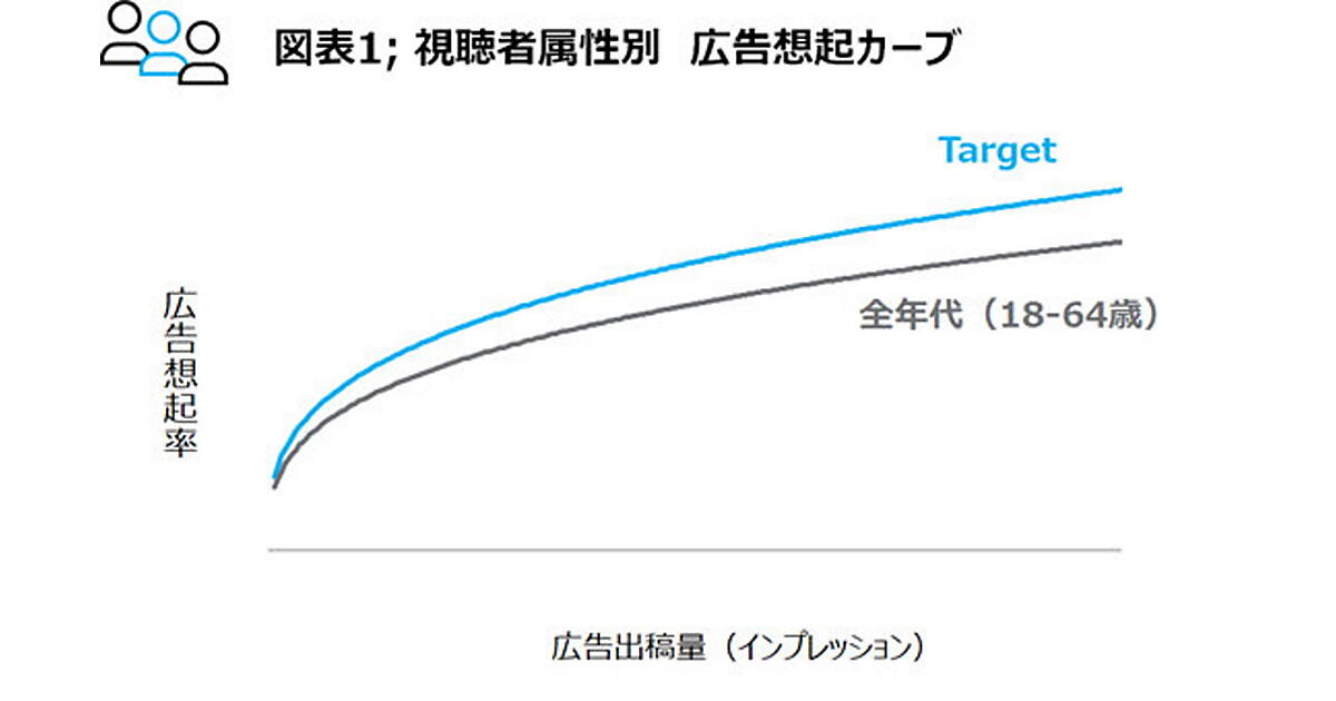 まず、広告想起率と広告出稿量(インプレッション)との関係を、性年代の視聴者属性別に分析した。その結果、全年代(18~64歳)における広告想起率よりも、ターゲットにおける広告想起率のほうが高かった。