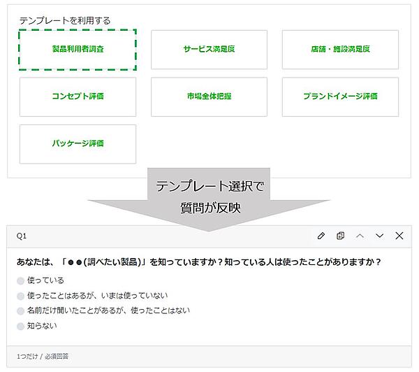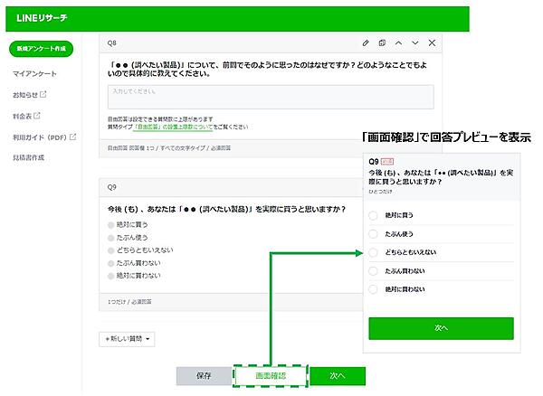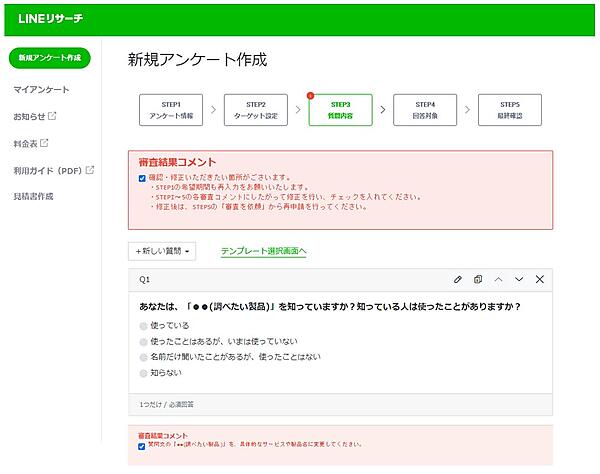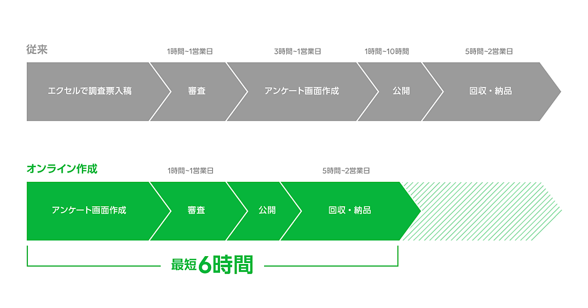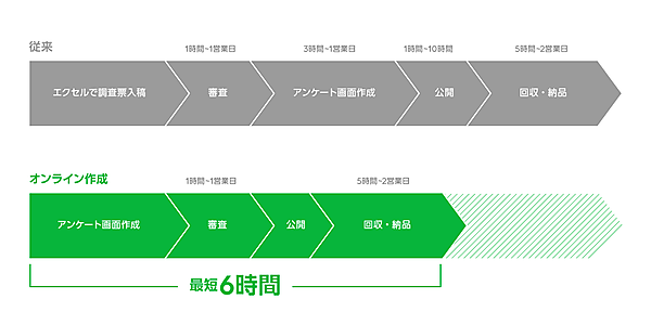 オンラインで作成は、これまで提出された調査票を基にLINEリサーチのオペレーターが行っていた画面作成の行程を企業の担当者が自らすることで、アンケート画面完成までの時間を短縮。担当者が設問内容や選択肢を自由に設定し、アンケートの作成・審査依頼がいつでも可能になる。審査完了後すぐアンケートが公開できる。