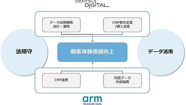 電通デジタルは、CMP(同意管理プラットフォーム)の導入を通じて個人情報データ収集の同意取得を行ってデータの利活用を進めてきた。今回、トレジャーデータのカスタマーデータプラットフォーム「Arm Treasure Data CDP」を活用し、データ活用の戦略設計から同意済みデータの施策との連携まで一括提供することにした。