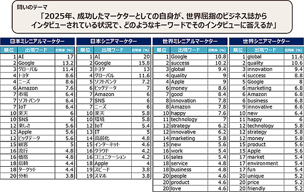 まず全2,000人に、「成功したマーケターとしての自身が、世界屈指のビジネス誌にインタビューされている状況」を想像してもらい、どのようなキーワードでそのインタビューに答えるか聞いた。その結果、日本はミレニアルマーケター、シニアマーケターともに、具体的な企業や戦略を上回り「AI」が1位だった。一方世界のマーケターでは「AI」はランキング外。世界ミレニアルマーケターは「Google」を、世界シニアマーケターは「global」をキーワードとしてあげた。