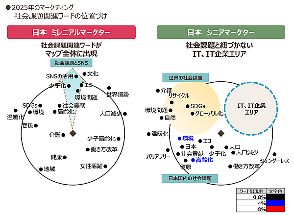最後に、「エコ」「少子化」「介護」「女性活躍」「老後」「SDGs」「世界情勢」など、社会課題関連ワードに焦点を当てると、ミレニアルマーケターのマップでは、キーワードがマップ全体に出現しているが、シニアマーケターでは、グローバルの課題か国内の課題かで、マッピングが分かれた。