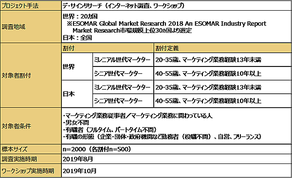 調査対象の内訳は、ミレニアルマーケター(20~35歳でマーケティング業務経験13年未満のマーケター)日本500人+世界500人の計1,000人、シニアマーケター(40~55歳でマーケティング業務経験10年以上)日本500人+世界500人の計1,000人、合計2,000人となっている。
