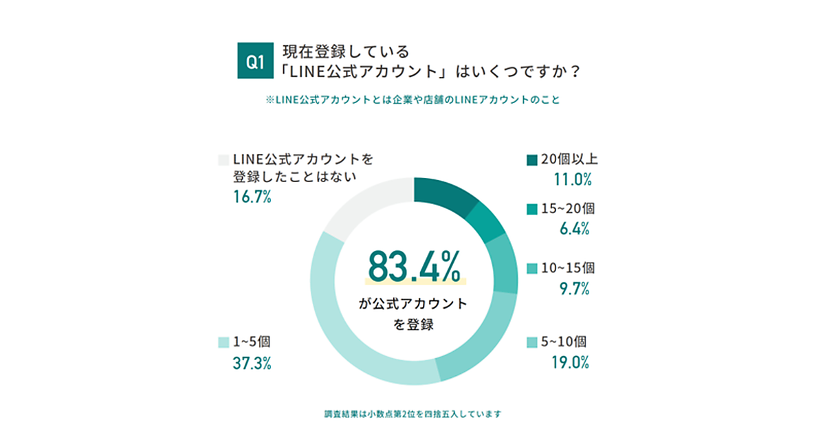 「LINE公式アカウント」について、登録を行っていたのは調査対象の83.4%。登録している公式アカウント数では「1~5個」37.3%、「5~10個」19.0%、「10~15個」9.7%、「15~20個」6.4%で、「20個以上」11.0%という人もいた。