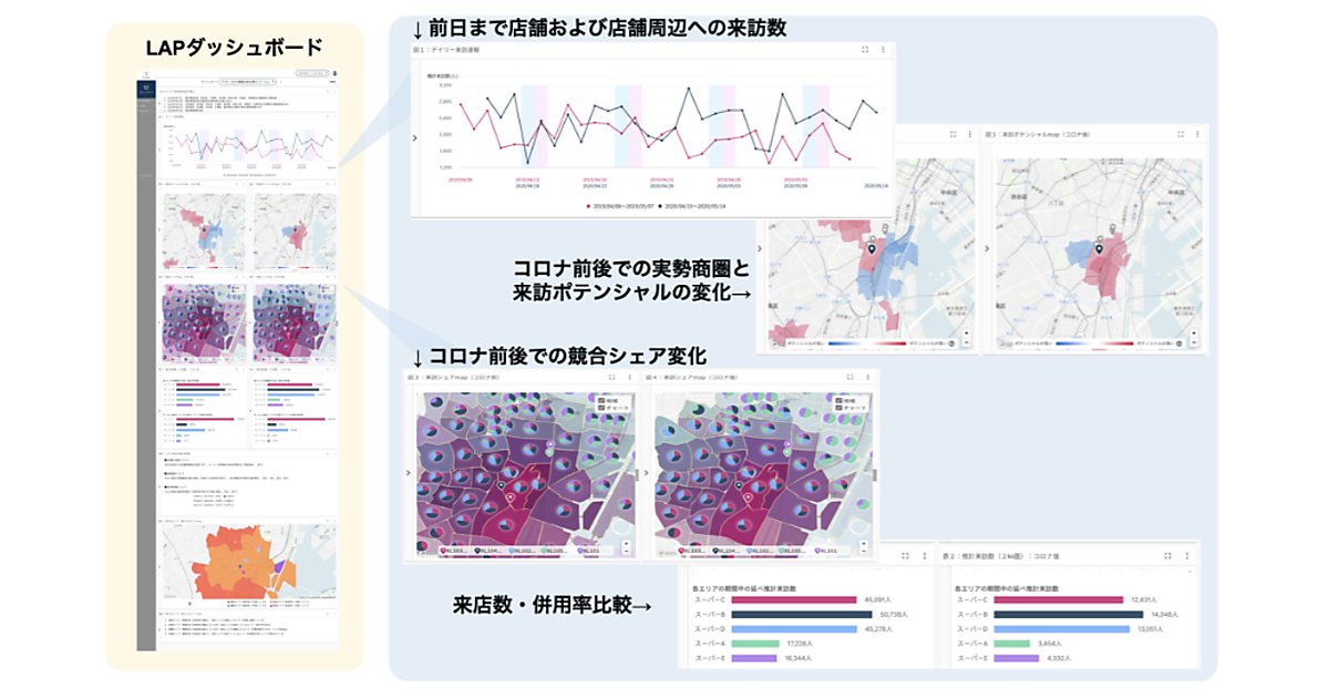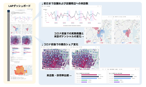 対策広告パッケージには、LAPで分析実行する設定や可視化、SNS広告の実施・測定がオールインワンで含まれる。マーケティング施策を行いたい店舗や地域を指定するだけで、コロナ禍で変化した消費者に対応した販売促進施策を実行できる。商圏内シェア率も丁目単位で比較・検証できるデータに基づいた広告マーケティングが行える。