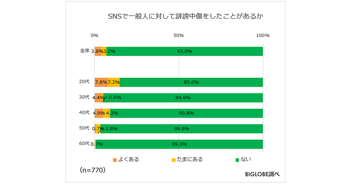 「SNSで他者から誹謗中傷をされたことがある」20代は3割弱