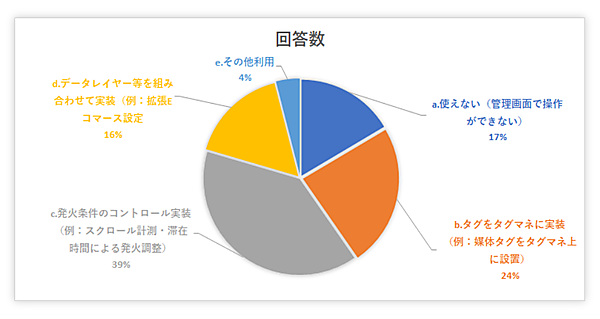 まずタグマネージャー(タグマネ)の使いこなしの状況について聞くと、「使えない(管理画面で操作できない)」17%、「タグをタグマネに実装(例:媒体タグをタグマネ上に設置)」24%、「発火条件のコントロール実装(例:スクロール計測・滞在時間による発火調整)」39%、「データレイヤー等を組み合わせて実装(例:拡張Eコマース設定)」16%、「その他利用」4%となった。完璧に使えるという人は少ないが、スキルに合わせて各社が使いこなしている状況だ。